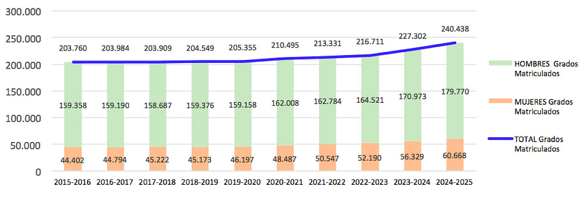 De hecho, el número de matriculadas en Grados de Ingeniería ha crecido un 36,63% en diez años, y en el caso de los Grados no habilitantes el aumento alcanza un llamativo 76,49%. En términos de resultados académicos, también se aprecia un desempeño destacado: las egresadas en Grado han aumentado un 20% en nueve años, superando el ritmo de crecimiento de los hombres.